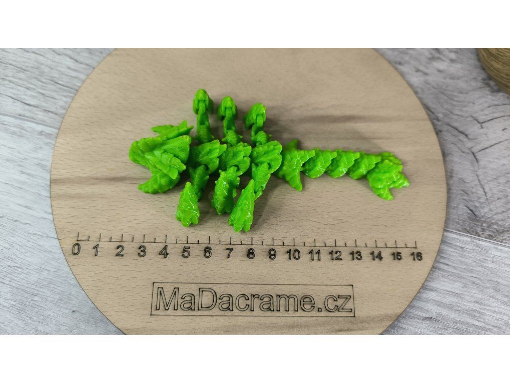 Duna dragon je tištěn z PET‑G, materiálu, který v dílně MaDacrame používáme pro jeho pevnost, pružnost a dlouhodobou stabilitu. Na rozdíl od PLA není křehký, lépe snáší teplotní změny a umožňuje vytvářet detailní, pohyblivé konstrukce bez rizika praskání. Díky tomu je model vhodný nejen jako estetický objekt, ale i jako plně funkční pohyblivý 3D tištěný drak, který zvládá časté ohýbání a manipulaci.