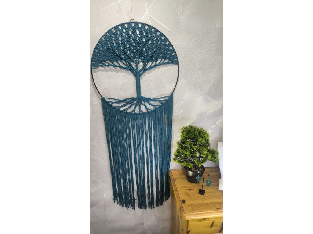 Strom života – Monumentální český lapač snů z macramé v modré barvě Boho dominanta s klidnou energií – ručně vyráběný originál z české tvorby