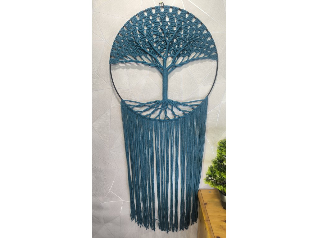 Tento monumentální český lapač snů ve tvaru Stromu života je víc než dekorace — je to umělecký talisman, který přináší do prostoru hloubku, harmonii a vizuální sílu. Ručně vyrobený technikou macramé (drhání), s průměrem 60 cm a více než 24 hodinami pečlivé práce, představuje spojení tradičního řemesla s moderním boho stylem. Modrý strom v kovovém kruhu působí jako dominanta interiéru, která zklidní mysl a propojí prostor s přírodou.